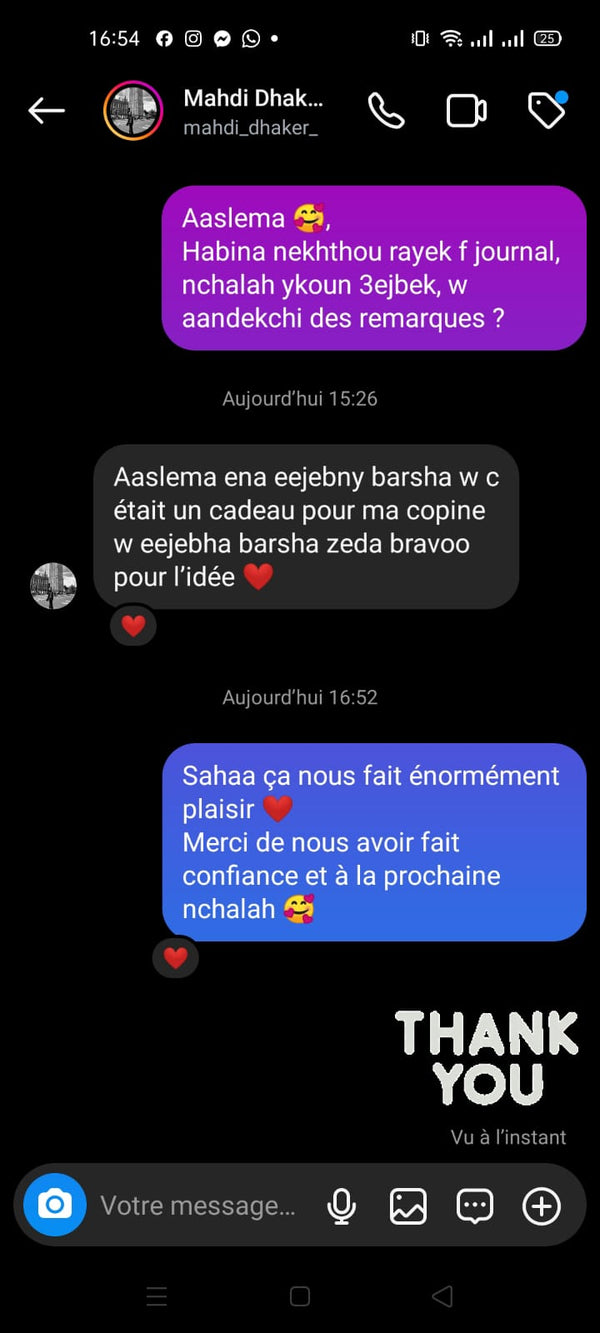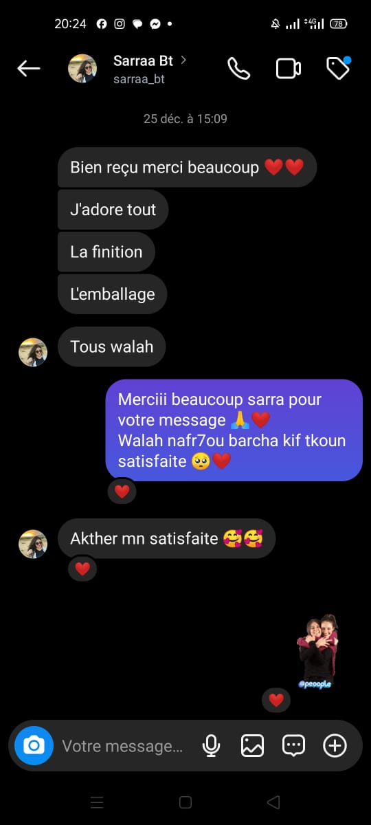 Bien reçu merci beaucoup ❤️, J'adore tout, La finition, L'emballage.. tous walah Akther mn satisfaite ❤️❤️