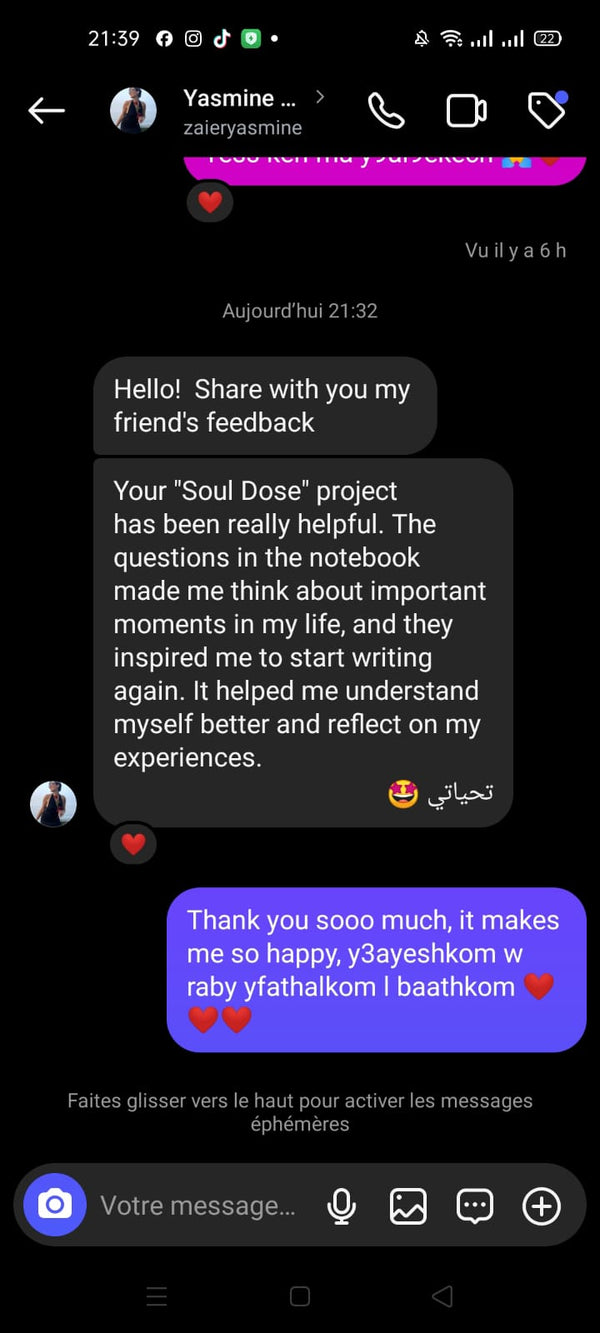 Your "Soul Dose" project has been really helpful. The questions in the notebook made me think about important moments in my life, and they inspired me to start writing again. It helped me understand myself better and reflect on my experiences. تحياتي